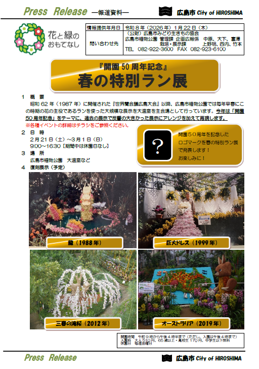 昭和62年(1987年)に開催された『世界蘭会議広島大会』以降、広島市植物公園では毎年早春にこの時期の花の主役であるランを使った大規模な展示を大温室を主会場として行っています。今年は「開園50周年記念」をテーマに、過去の展示で反響の大きかった展示にアレンジを加えて再現します。