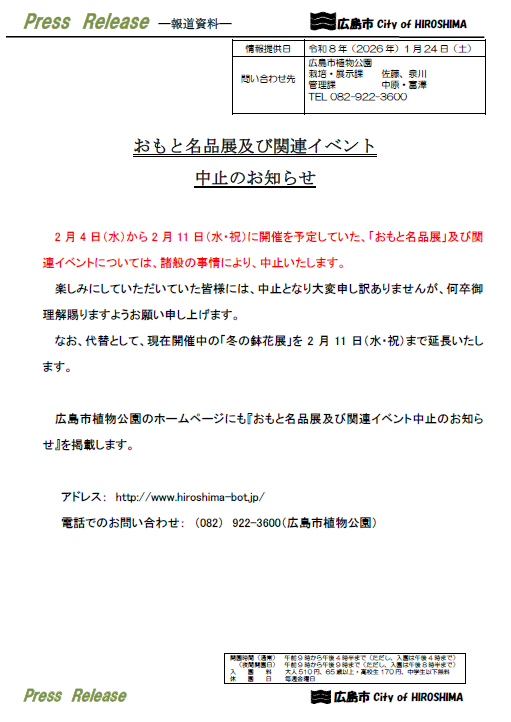なお、代替として、現在開催中の「冬の鉢花展」を2月11日(水・祝)まで延長いたします。 広島市植物公園のホームページにも『おもと名品展及び関連イベント中止のお知らせ』を掲載します。