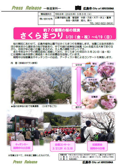 また今年はサクラの開花促成に挑戦しており、さくらまつり初日の3月20日(金・祝)には満開の染井吉野と舞姫各1本のお披露目を目指しています。 期間中は桜観賞会やキッチンカーの出店、アーティスト等によるコンサートも実施します。