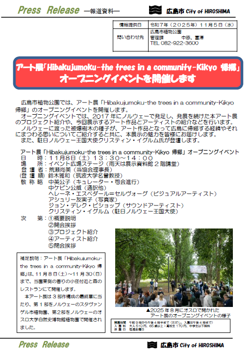 広島市植物公園では、アート展「Hibakujumoku-the trees in a community-Kikyo 帰郷」のオープニングイベントを開催します。