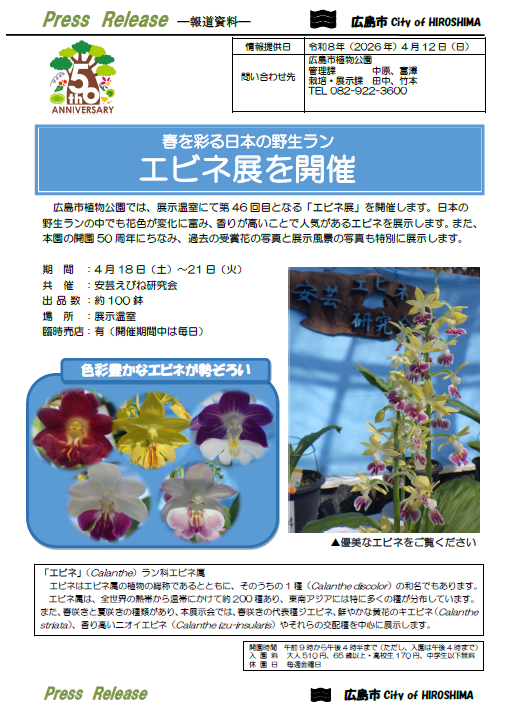 広島市植物公園では、展示温室にて第46回目となる「エビネ展」を開催します。日本の野生ランの中でも花色が変化に富み、香りが高いことで人気があるエビネを展示します。また、本園の開園50周年にちなみ、過去の受賞花の写真と展示風景の写真も特別に展示します。
