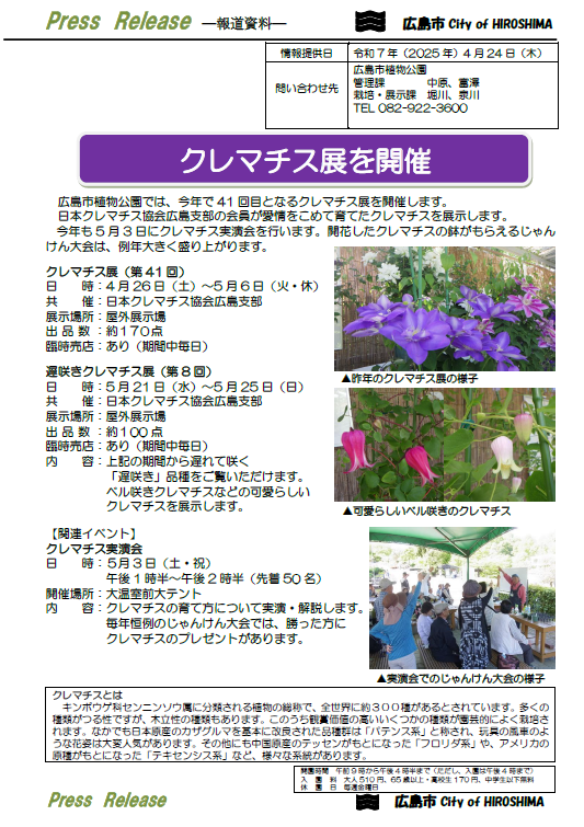 広島市植物公園では、今年で41回目となるクレマチス展を開催します。