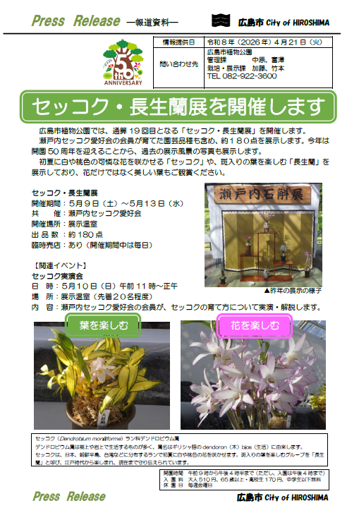 瀬戸内セッコク愛好会の会員が育てた園芸品種も含め、約180点を展示します。今年は開園50周年を迎えることから、過去の展示風景の写真も展示します。 初夏に白や桃色の可憐な花を咲かせる「セッコク」や、斑入りの葉を楽しむ「長生蘭」を展示しており、花だけではなく美しい葉もご観賞ください。