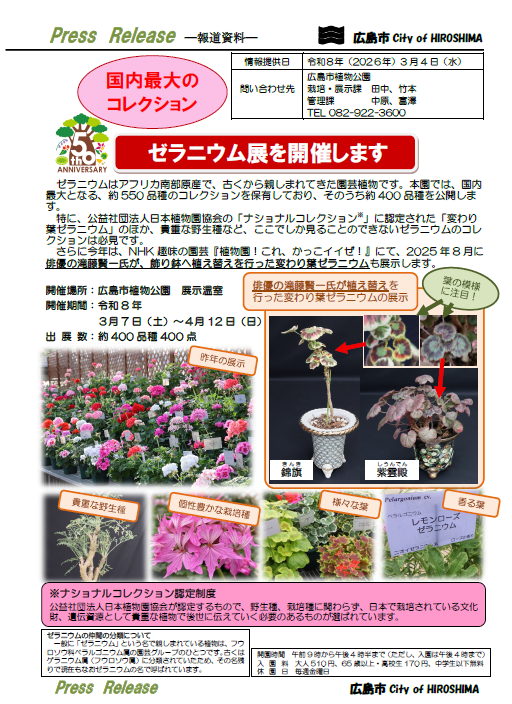 特に、公益社団法人日本植物園協会の「ナショナルコレクション※」に認定された「変わり葉ゼラニウム」のほか、貴重な野生種など、ここでしか見ることのできないゼラニウムのコレクションは必見です。 さらに今年は、NHK趣味の園芸『植物園!これ、かっこイイぜ!』にて、2025年8月に俳優の滝藤賢一氏が、飾り鉢へ植え替えを行った変わり葉ゼラニウムも展示します。