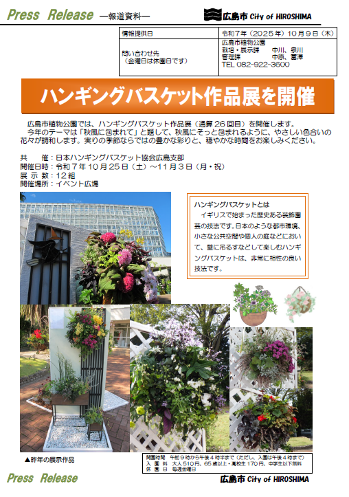 広島市植物公園では、ハンギングバスケット作品展(通算26回目)を開催します。