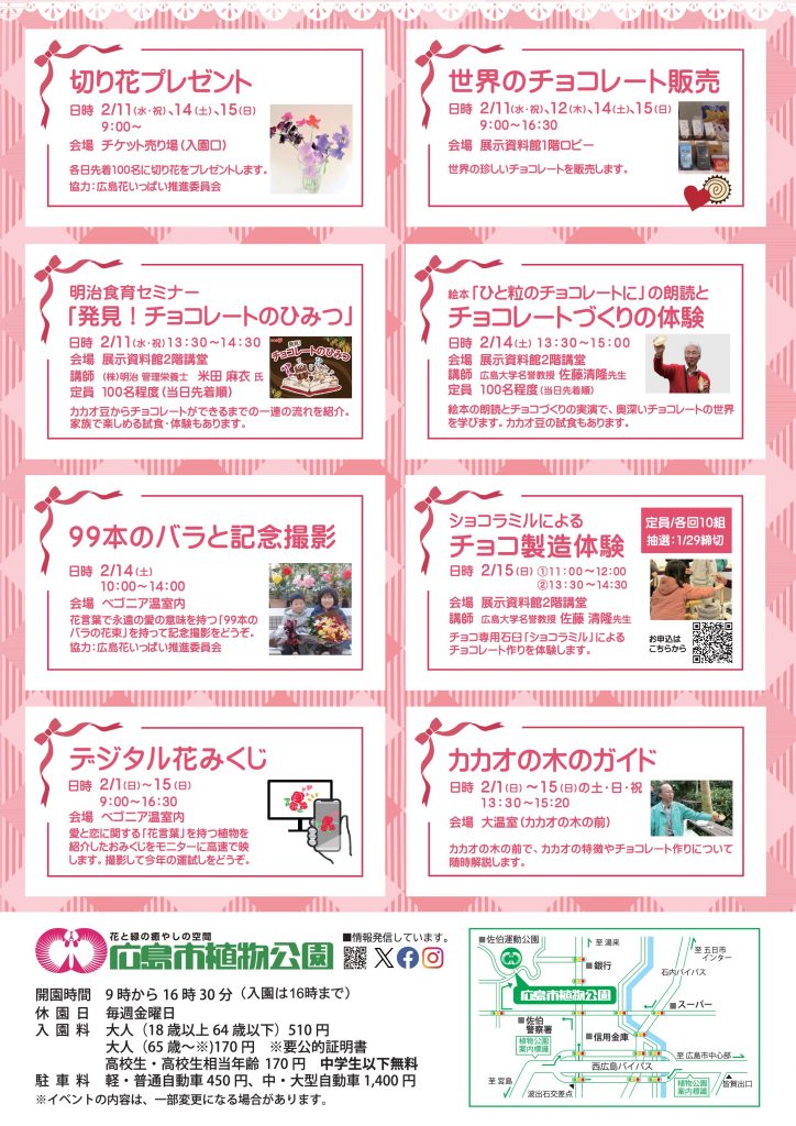 会期:2月1日(日)~2月15日(日) 切り花プレゼント(フラワーバレンタイン)や99本のバラの花束、絵本「ひと粒のチョコレートに」の朗読、専用石うすによるチョコ作り実演(事前申込制)、食育セミナーなど関連イベントを実施します。 イベントちらし(PDF)