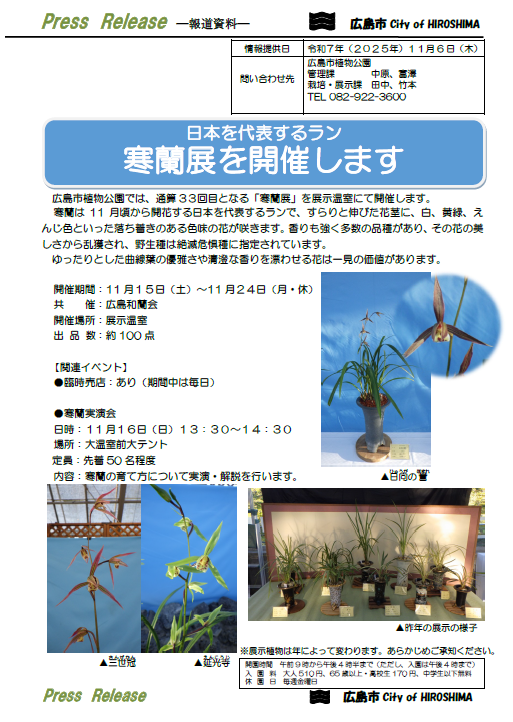 定員:先着50名程度 内容:寒蘭の育て方について実演・解説を行います。
