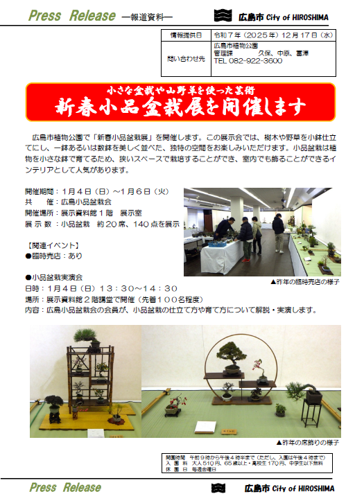 場所:展示資料館2階講堂で開催(先着100名程度) 内容:広島小品盆栽会の会員が、小品盆栽の仕立て方や育て方について解説・実演します。