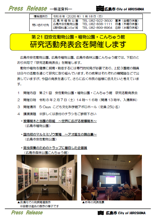 広島市安佐動物公園、広島市植物公園、広島市森林公園こんちゅう館では、下記のとおり共同で「研究活動発表会」を開催します。
