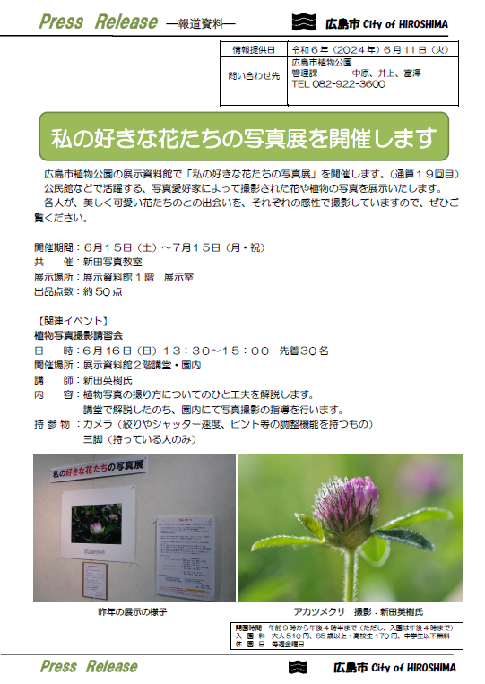 広島市植物公園の展示資料館で「私の好きな花たちの写真展」を開催します。(通算19回目)