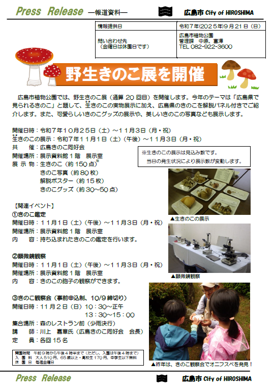 広島市植物公園では、野生きのこ展(通算20回目)を開催します。今年のテーマは「広島県で見られるきのこ」と題して、生きのこの実物展示に加え、広島県のきのこを解説パネル付きでご紹介します。また、可愛らしいきのこグッズの展示や、美しいきのこの写真なども展示します。