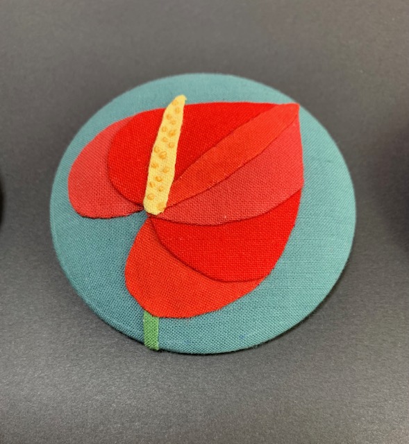 染布を使ってアンスリウムの花をアップリケし、直径8cmの丸いブローチに仕上げます。