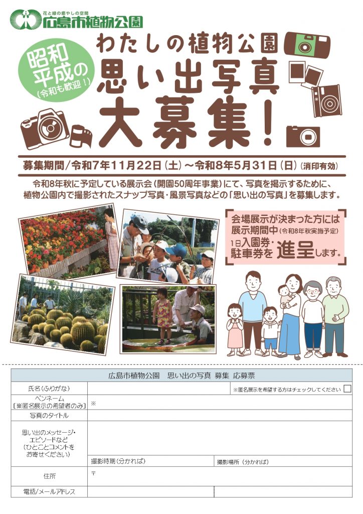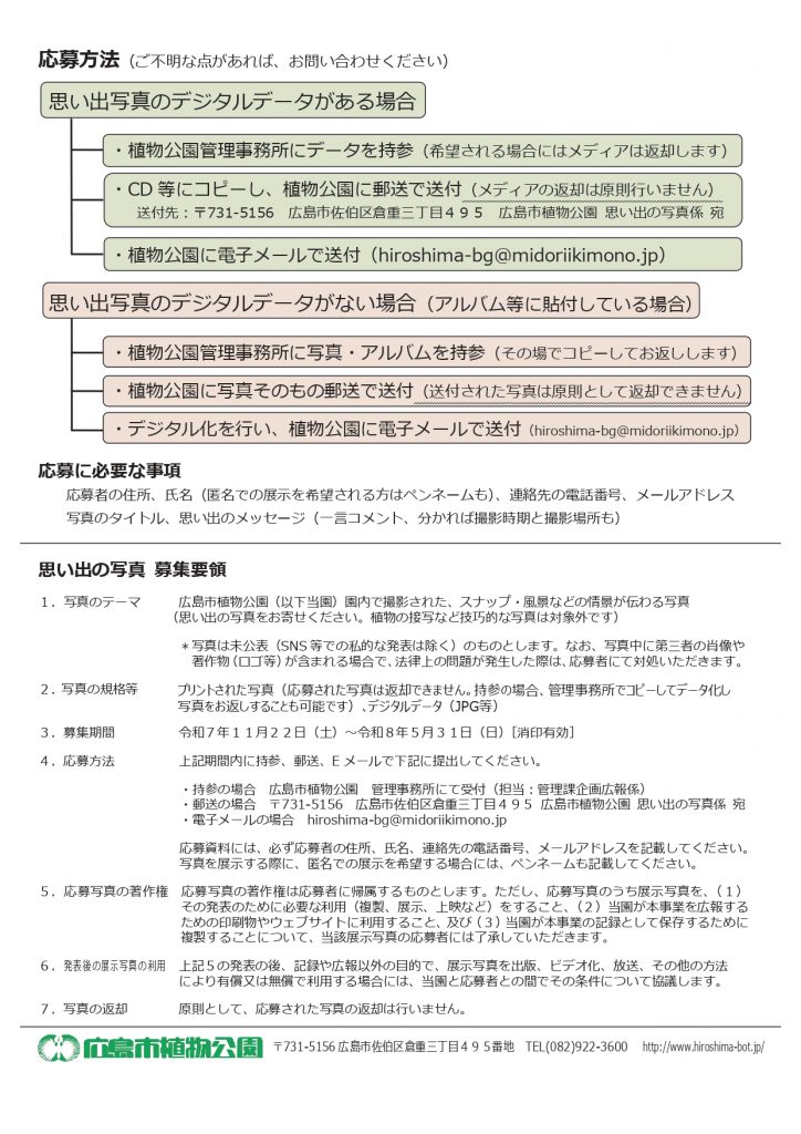 - 郵送の場合 〒731-5156 広島市佐伯区倉重三丁目495 広島市植物公園 思い出の写真係 宛