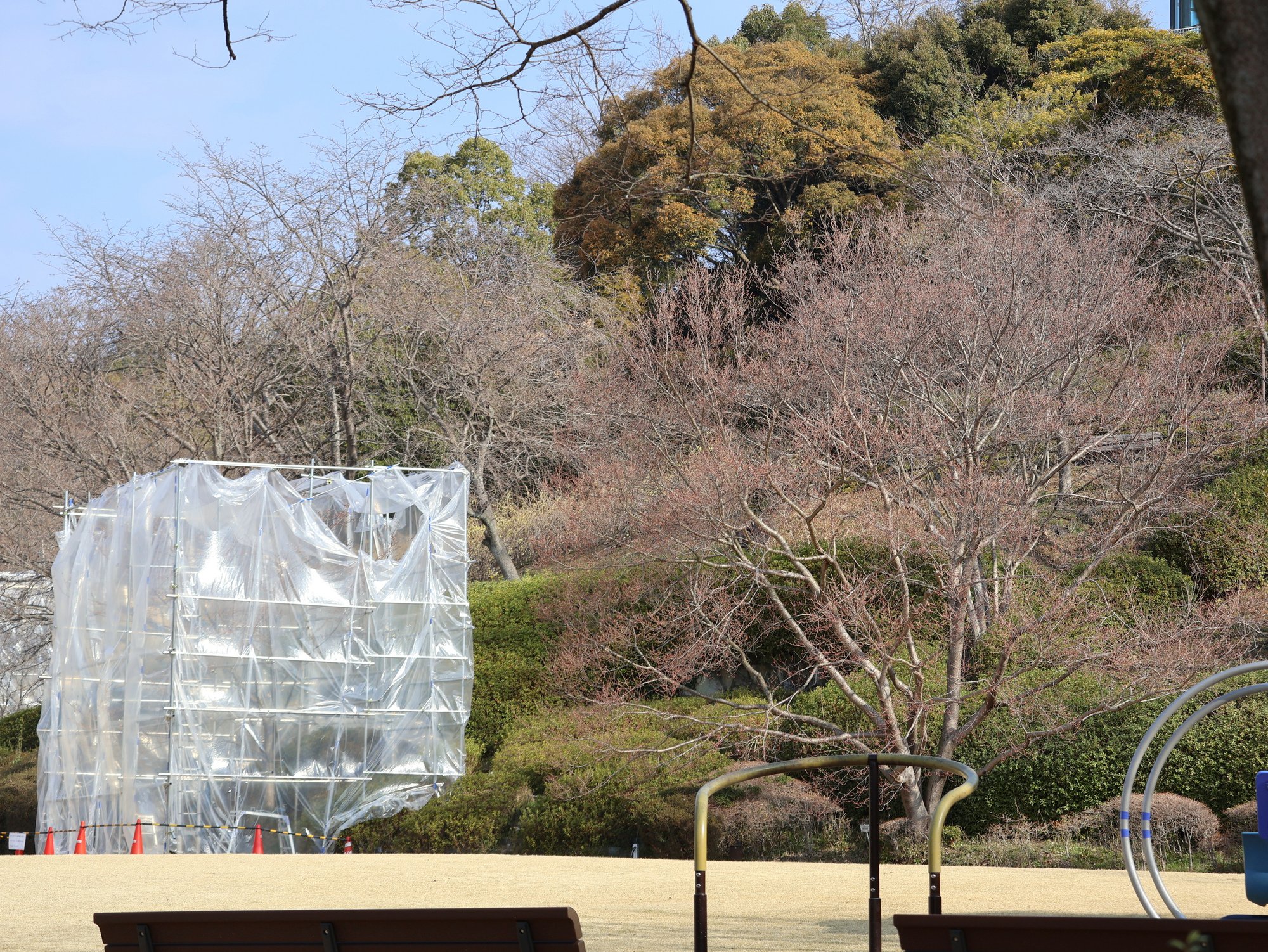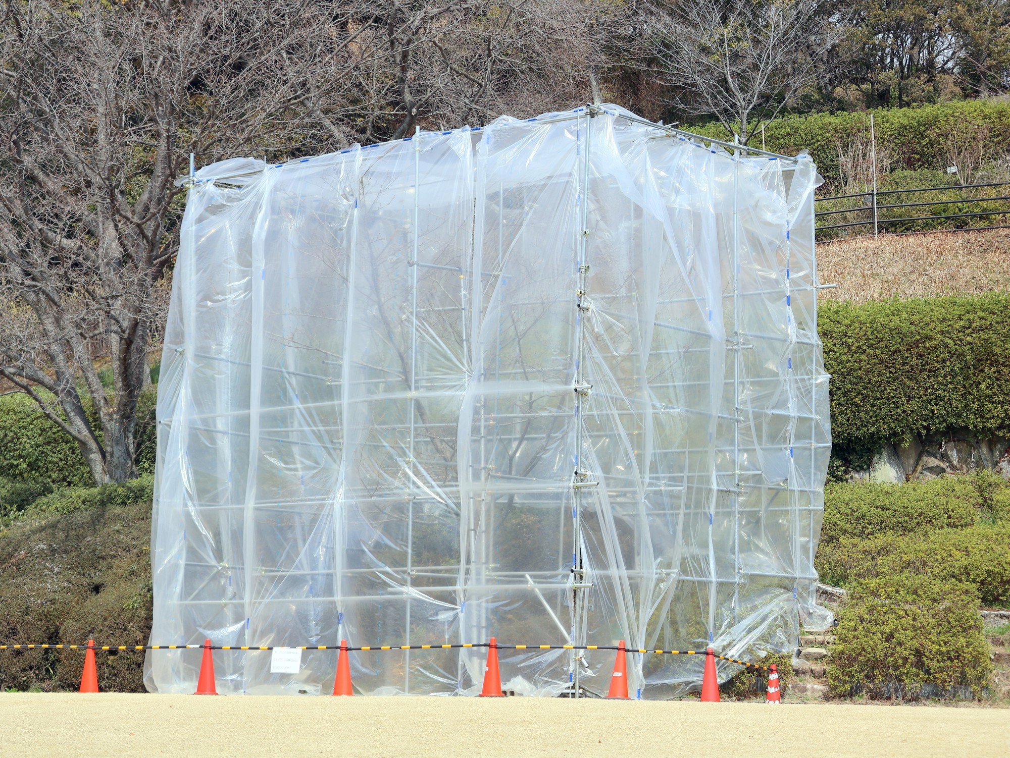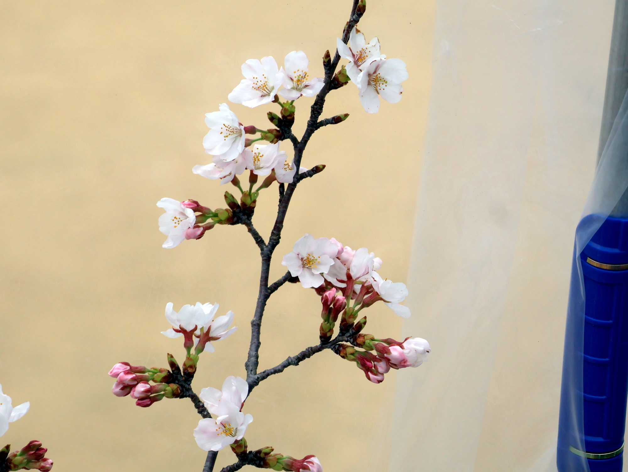 開花促成しているソメイヨシノは、五分咲きです。ビニールの外からも花が咲いている様子がはっきりと分かるようになりました。20日のさくらまつり初日には、ビニールと骨格を外し、見頃のソメイヨシノをお披露目します。