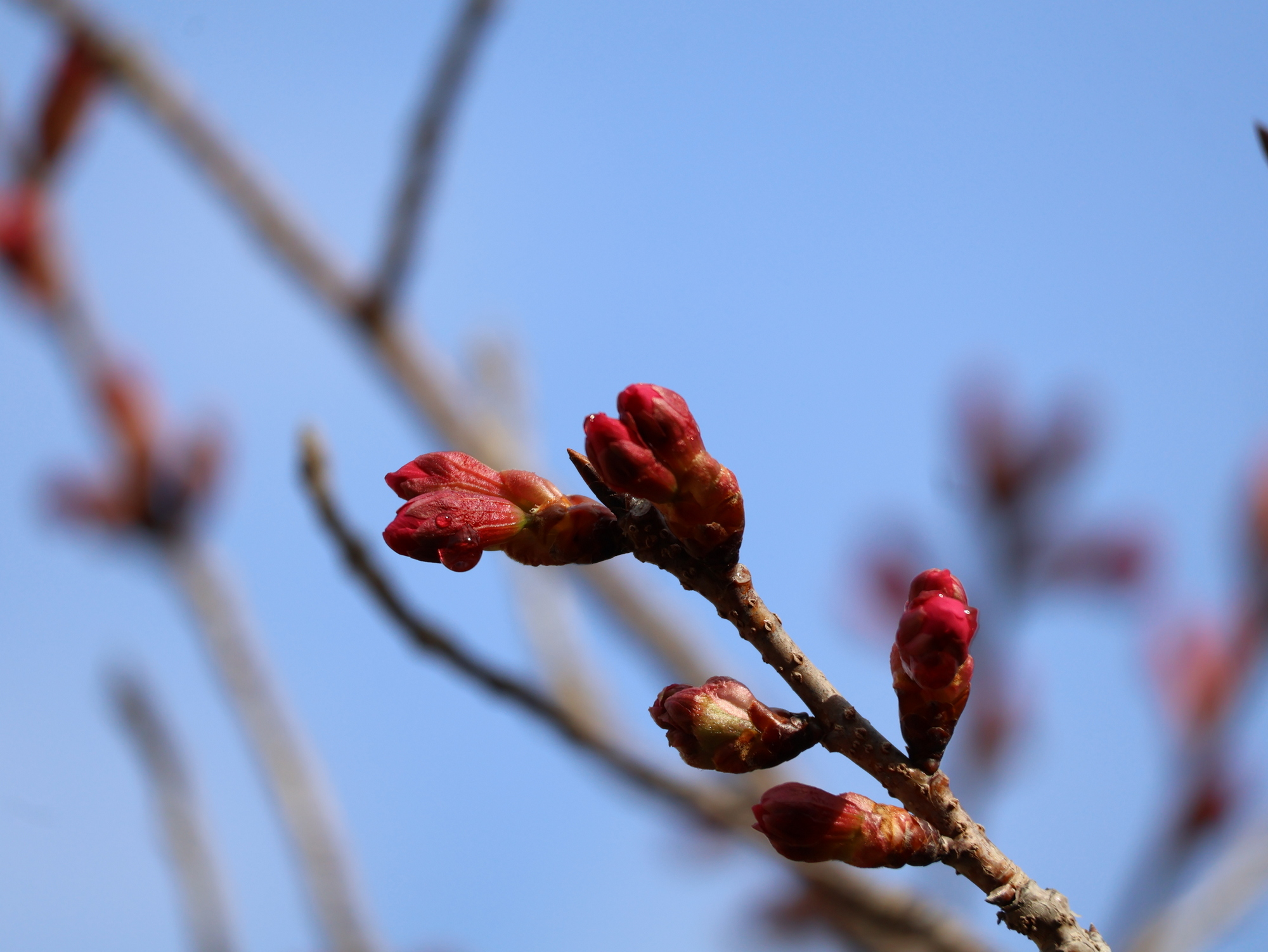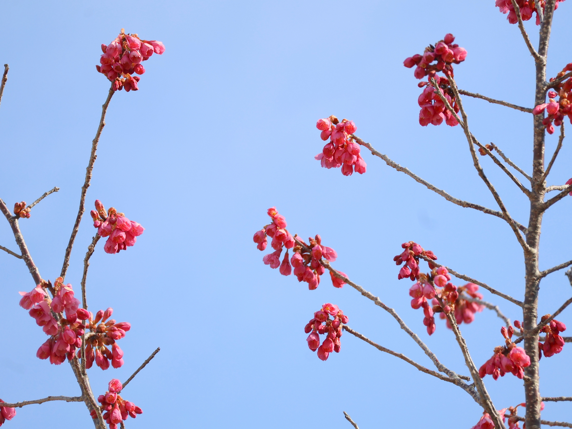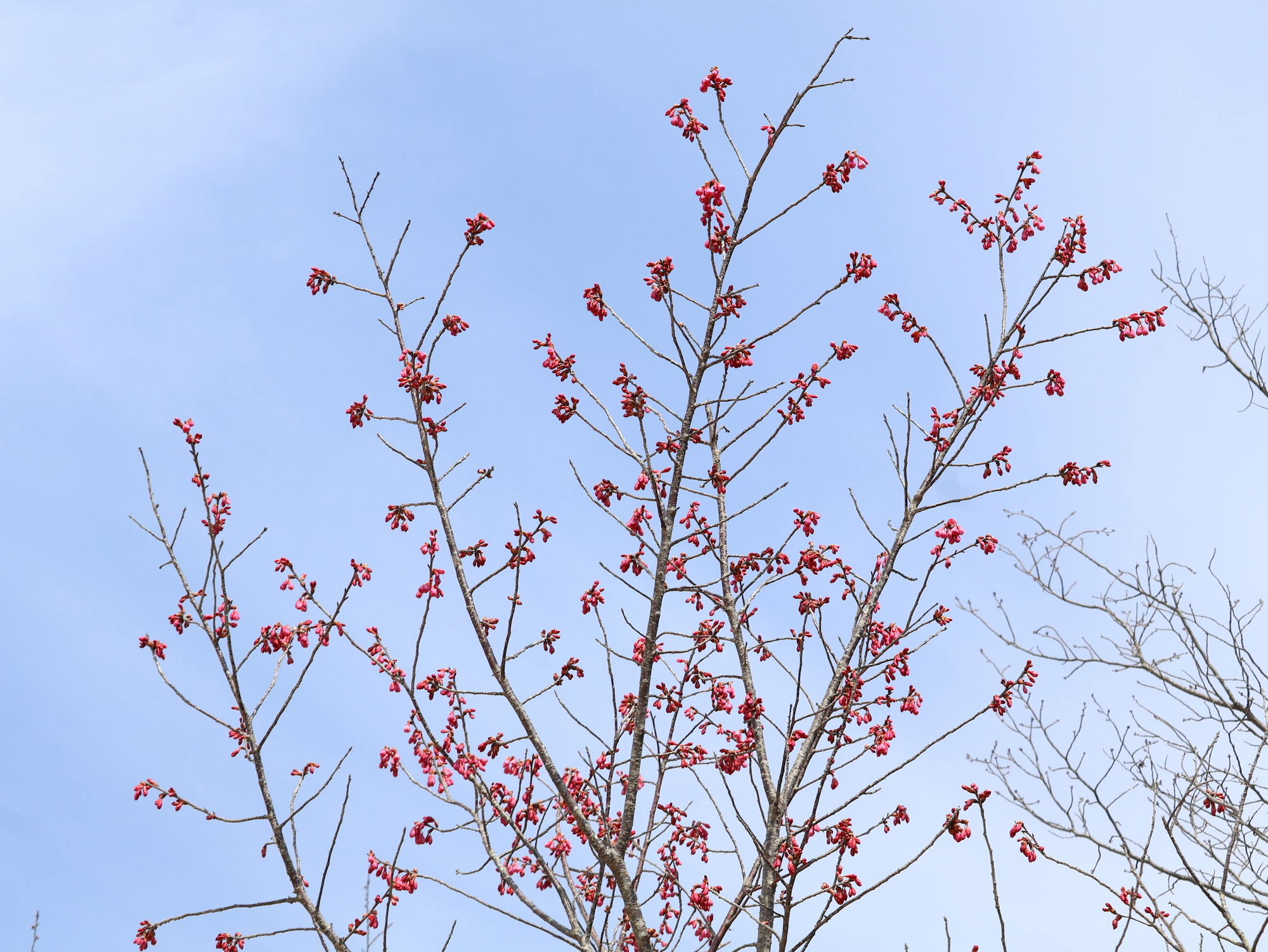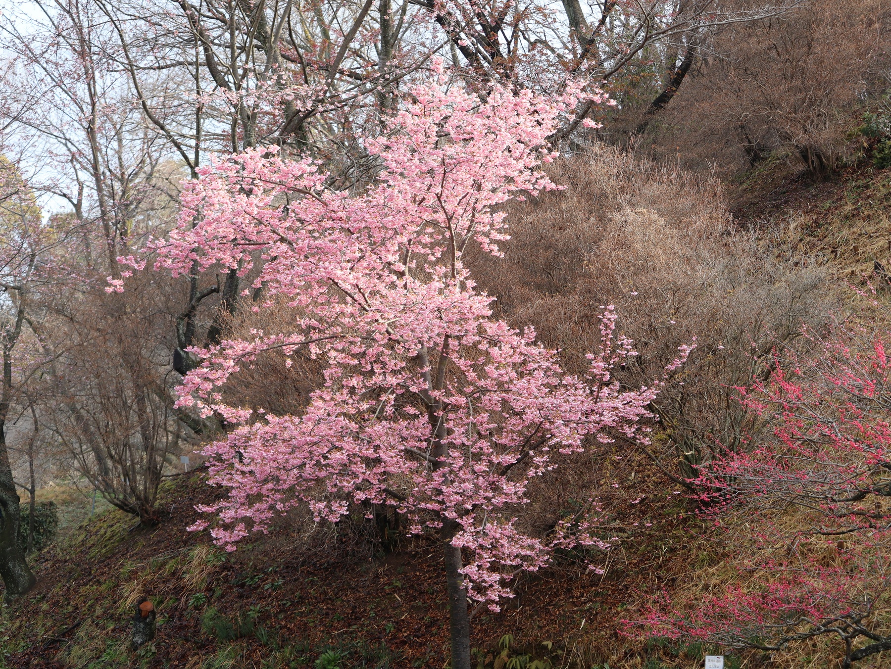 河津桜と寒桜は満開。観賞できるのはあと1週間ほどです。カンヒザクラは咲き始め。釣鐘型の赤い花がよく目立ちます。