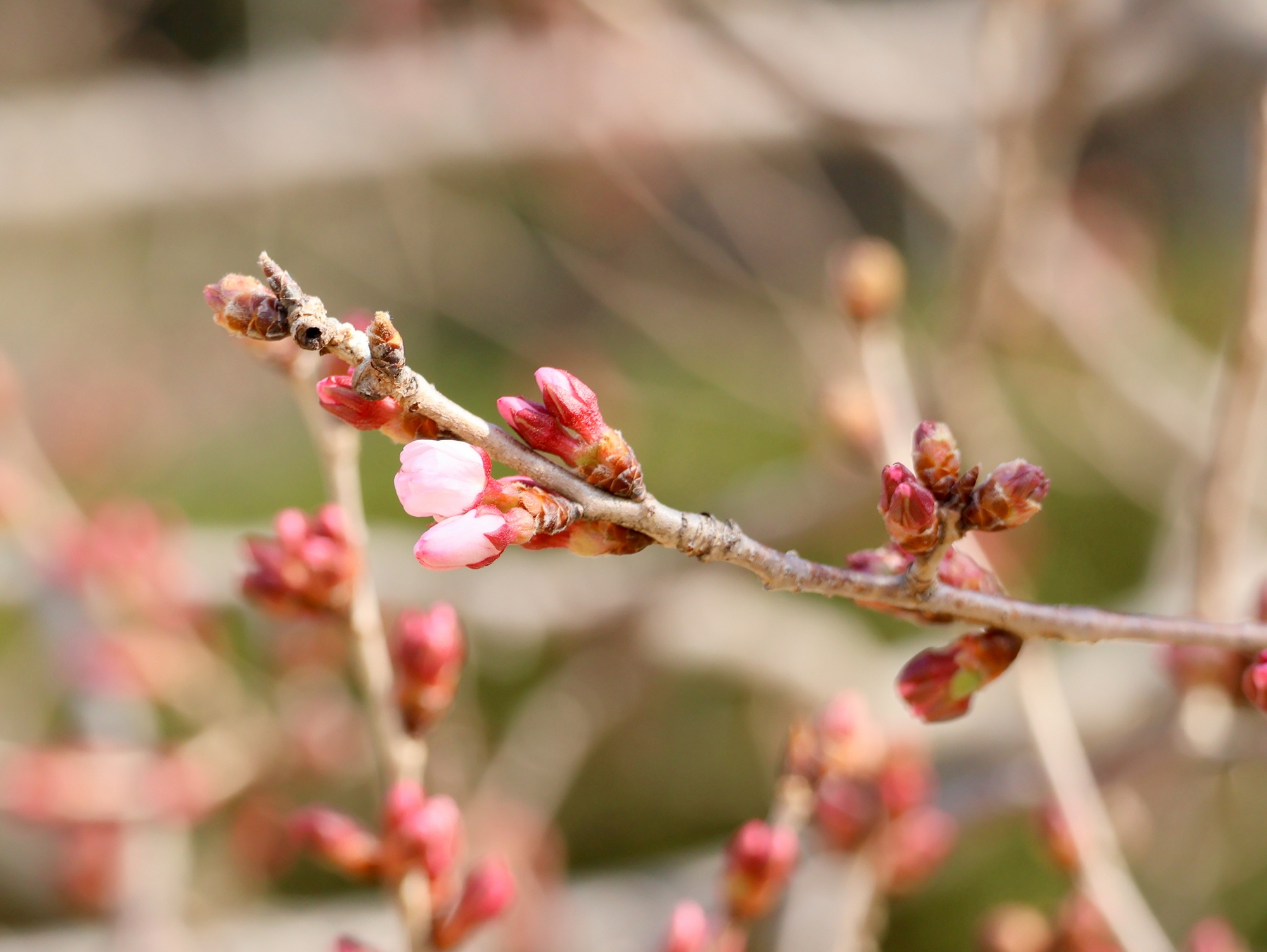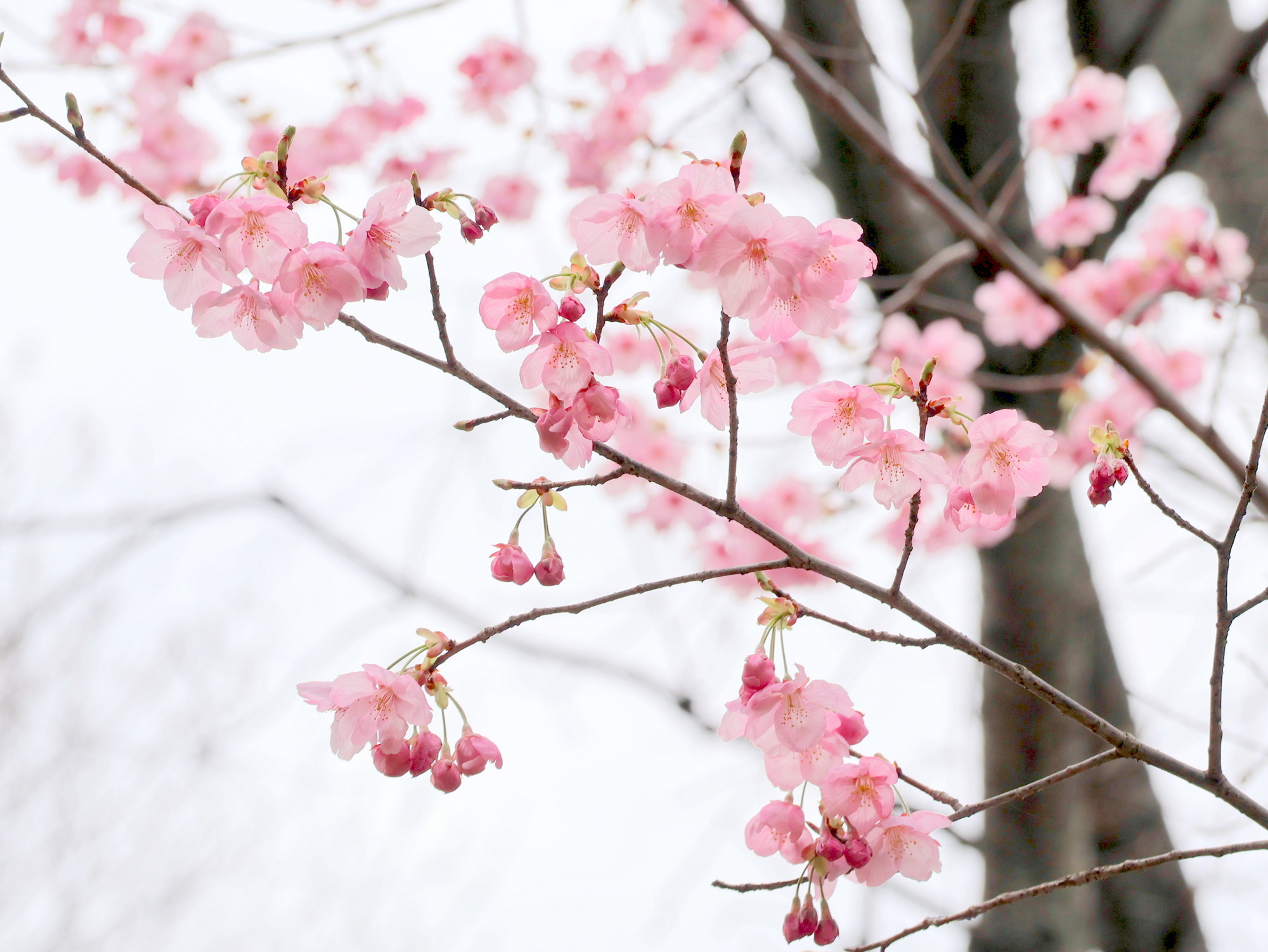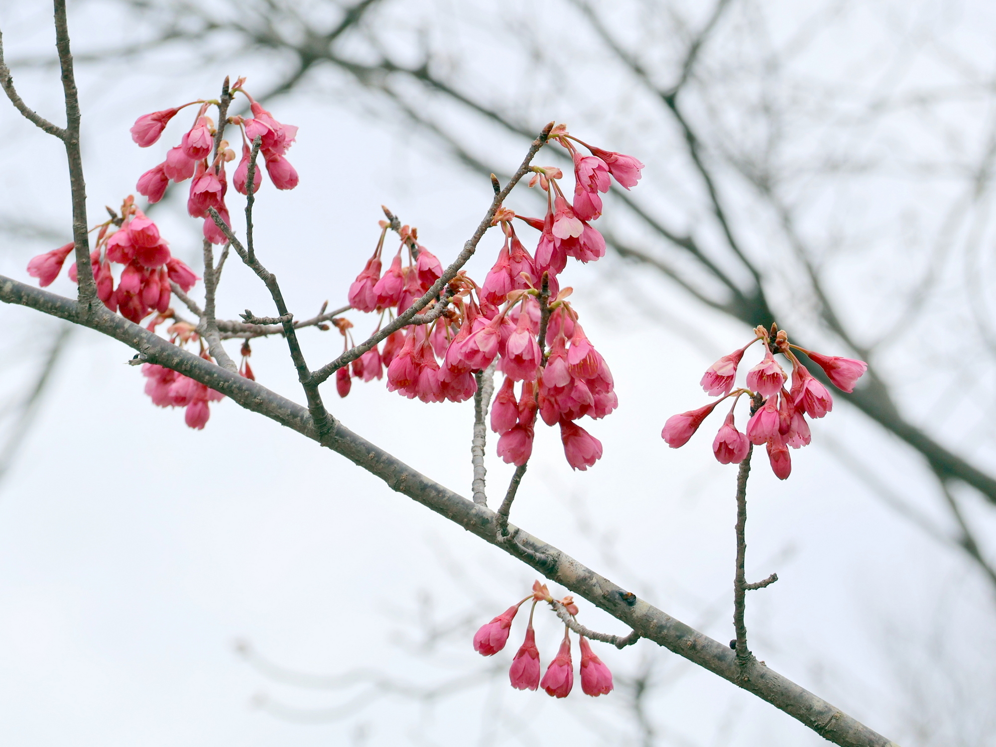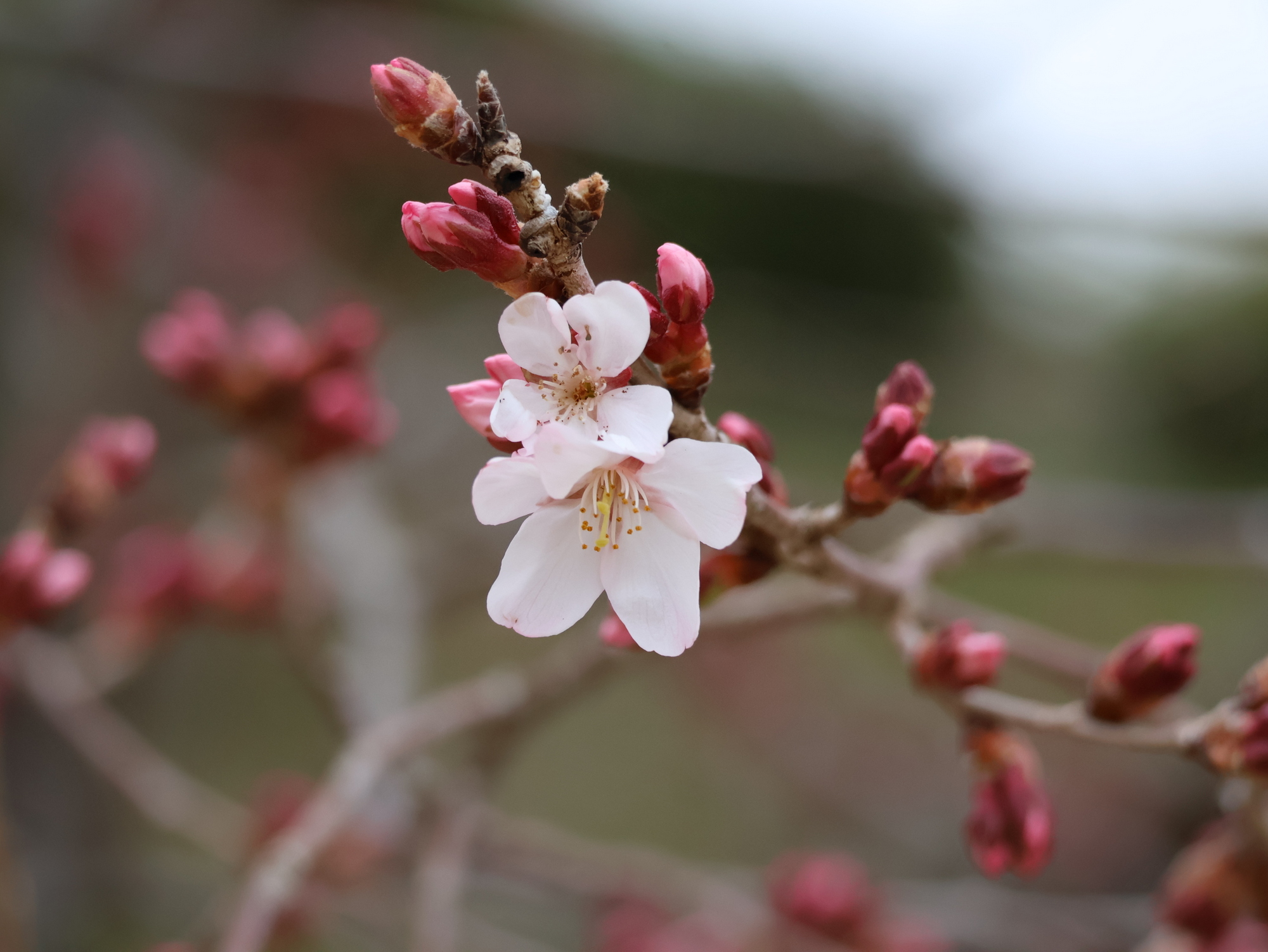 河津桜と寒桜は満開。観賞できるのはあと1週間ほどです。カンヒザクラは咲き始め。釣鐘型の赤い花がよく目立ちます。