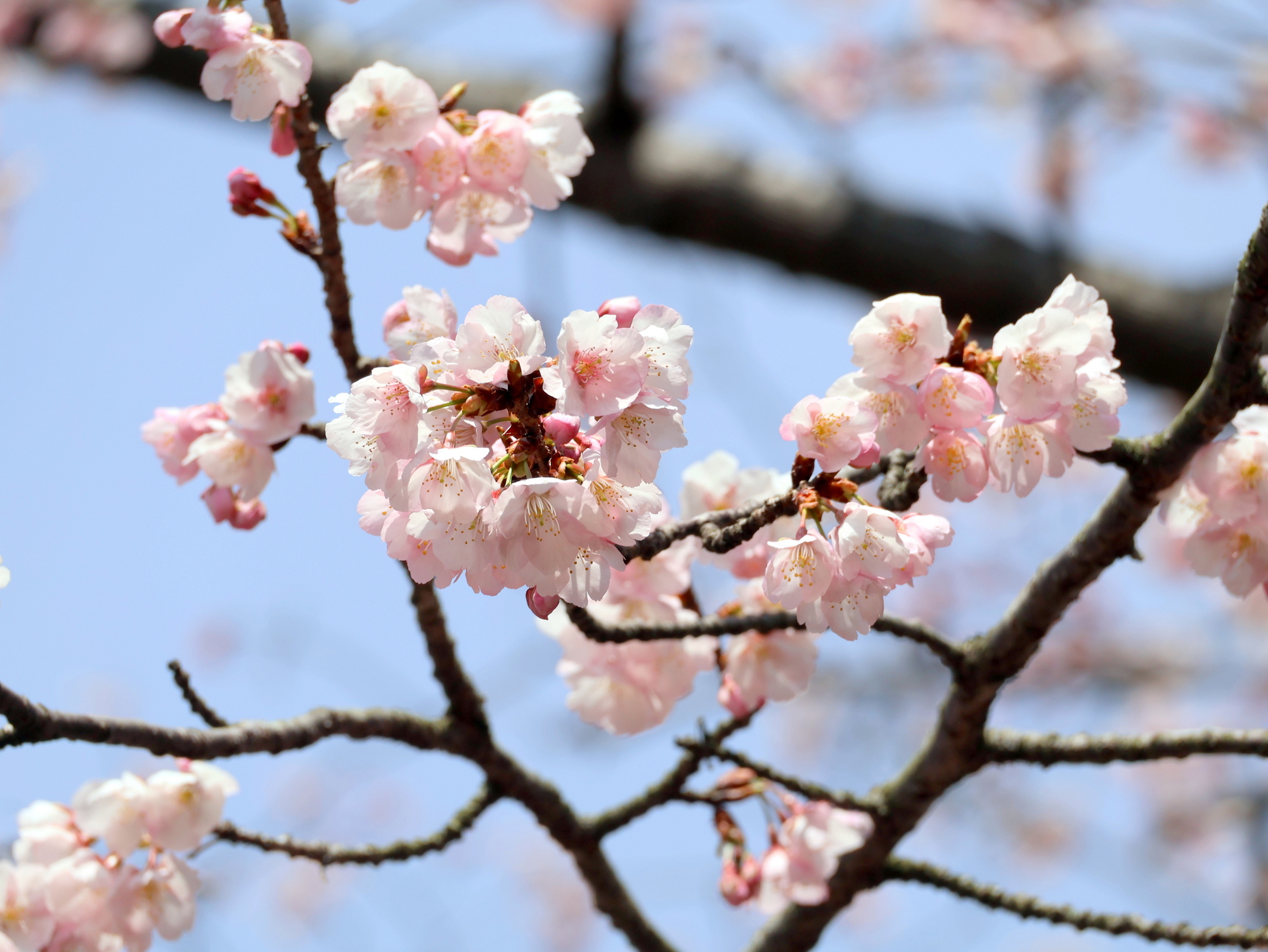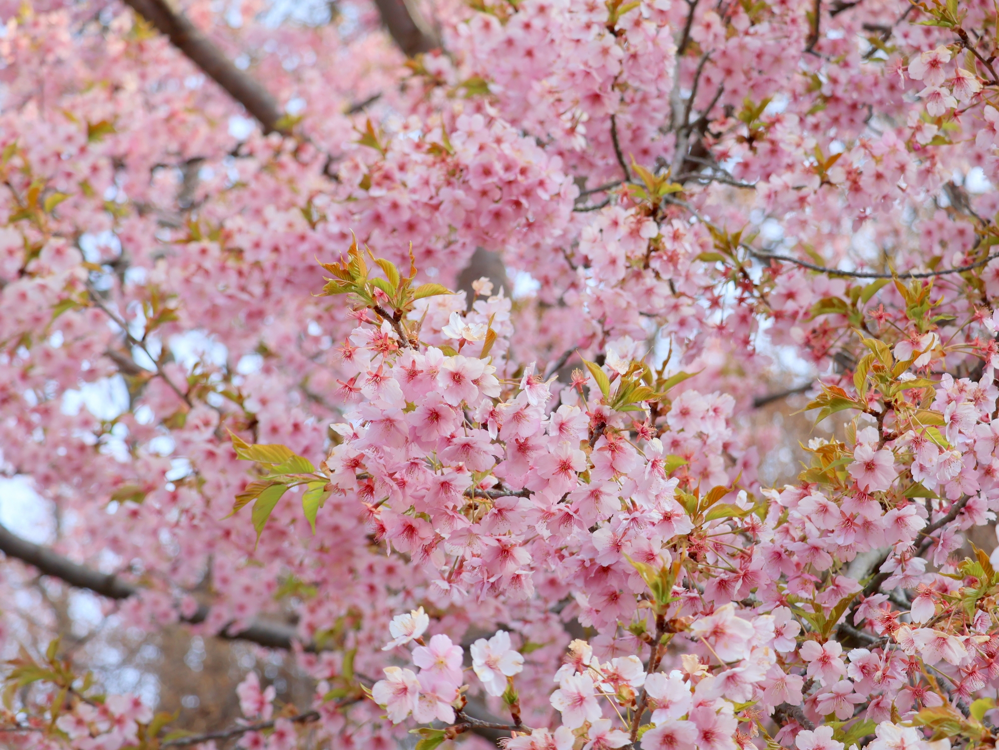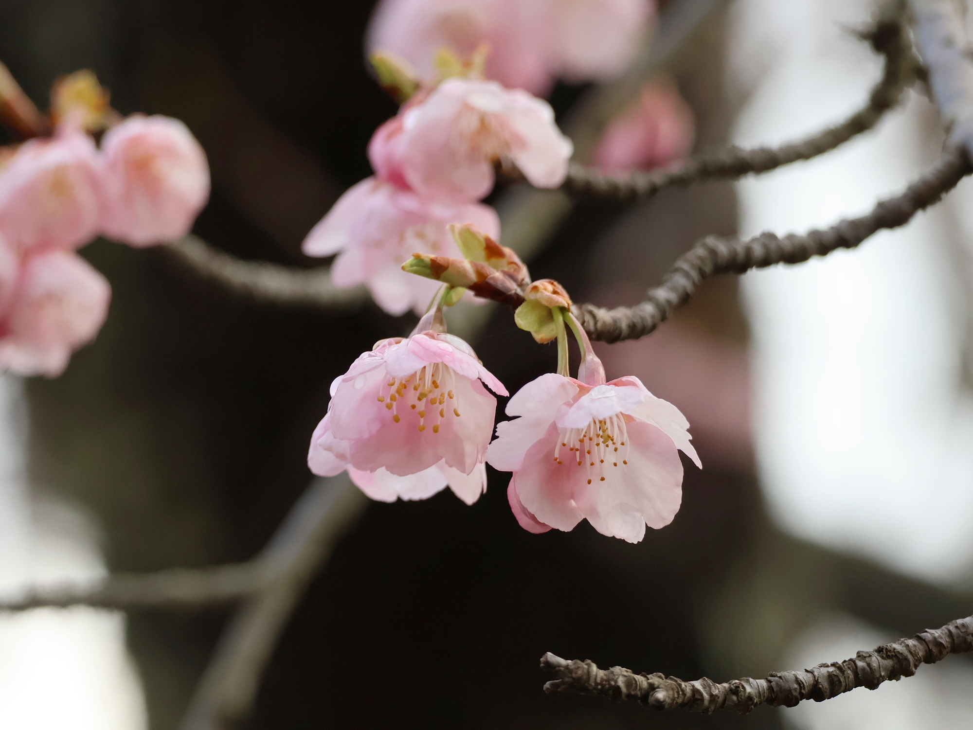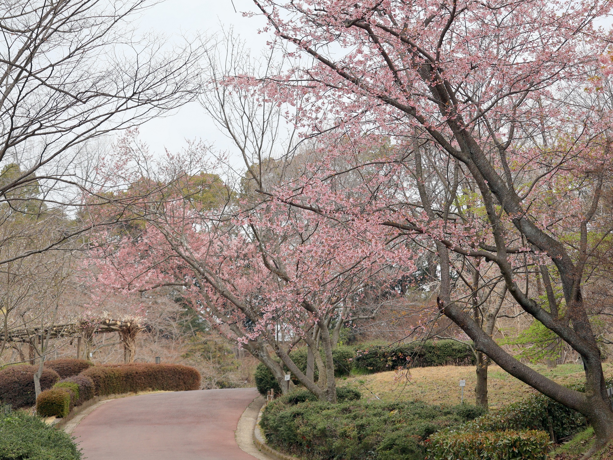 河津桜と寒桜は満開。観賞できるのはあと1週間ほどです。カンヒザクラは咲き始め。釣鐘型の赤い花がよく目立ちます。