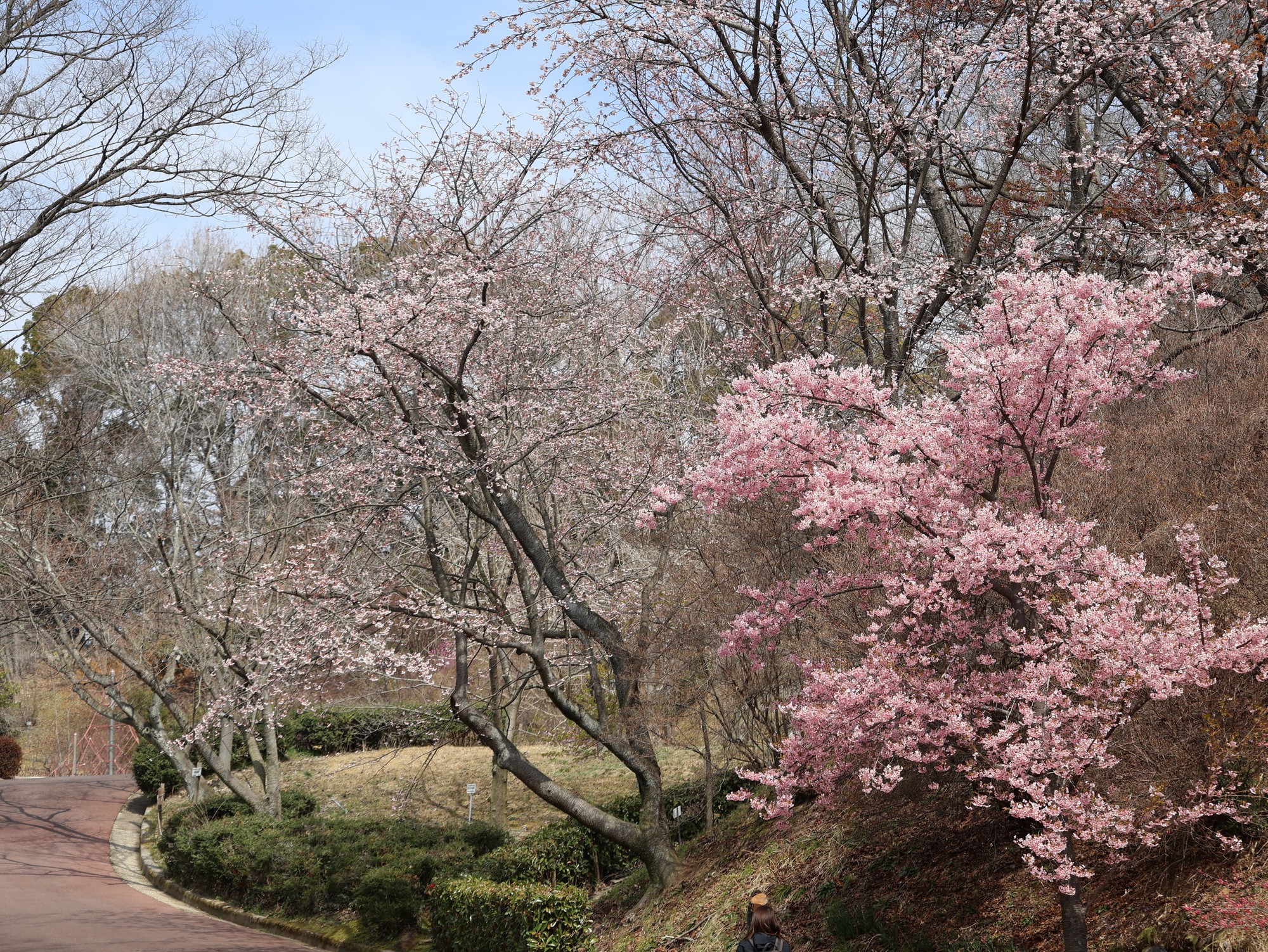 河津桜が満開で、ウメ園の紅梅(佐橋紅)とあわせて観賞できます。園路側の寒桜(晩咲き)も見頃を迎えています。カンヒザクラの蕾も膨らみ、あと数日で開花しそうです。