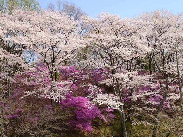 開花時期の異なるサクラがたくさん植栽されているため、長期間に渡って開花を楽しむことができることも当園の特徴のひとつです。河津桜など早咲きのものは2月ごろから開花が始まり、3月末ごろから染井吉野がお楽しみいただけます。その後、関山などの八重桜が咲き始め、特に遅咲きの菊桜の仲間は4月下旬に見頃を迎えます。