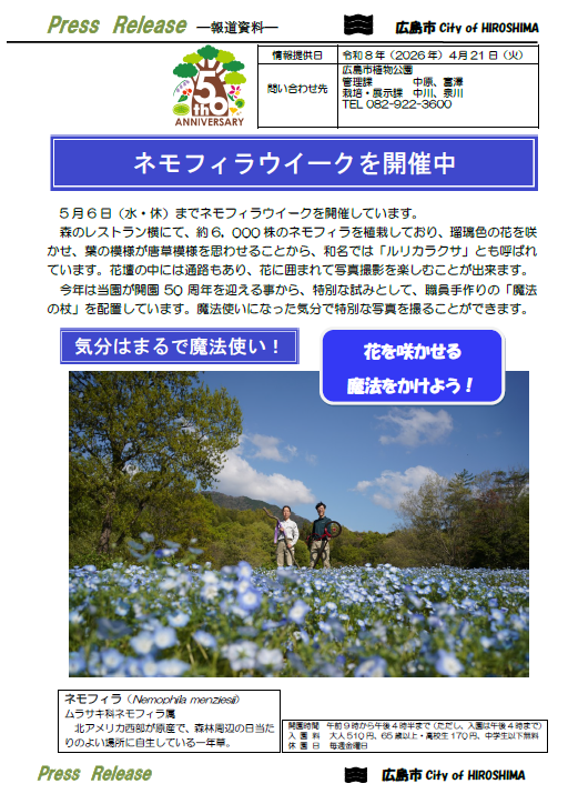 プレスリリース最新号 ネモフィラウィーク開催中(2026年4月21日) プレスリリースバックナンバー セッコク・長生蘭展(2026年4月21日) 趣味のボタニカルアート展(2026年4月16日) クレマチス展(2026年4月16日) エビネ展(2026年4月12日) 開園50周年特別企画展 蘭花譜展(2026年4月8日) 春の山野草展(2026年4月2日) サクラソウ展(2026年4月2日) 開花促成した染井吉野が開花しました(2026年3月14日) 「草木染の世界」展(2026年3月5日) 年別プレスリリース一覧 2026年 2025年 2024年 2023年