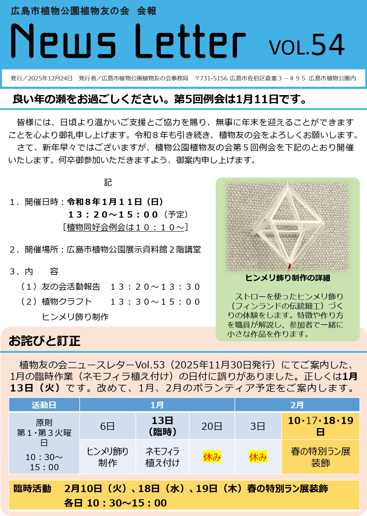 植物に関する話題や植物公園のできごとなどを載せた会誌「はなの輪」・植物友の会の情報を配信する「友の会ニュースレター」を定期的に発行し、植物公園管理事務所にて無料で配布しています。